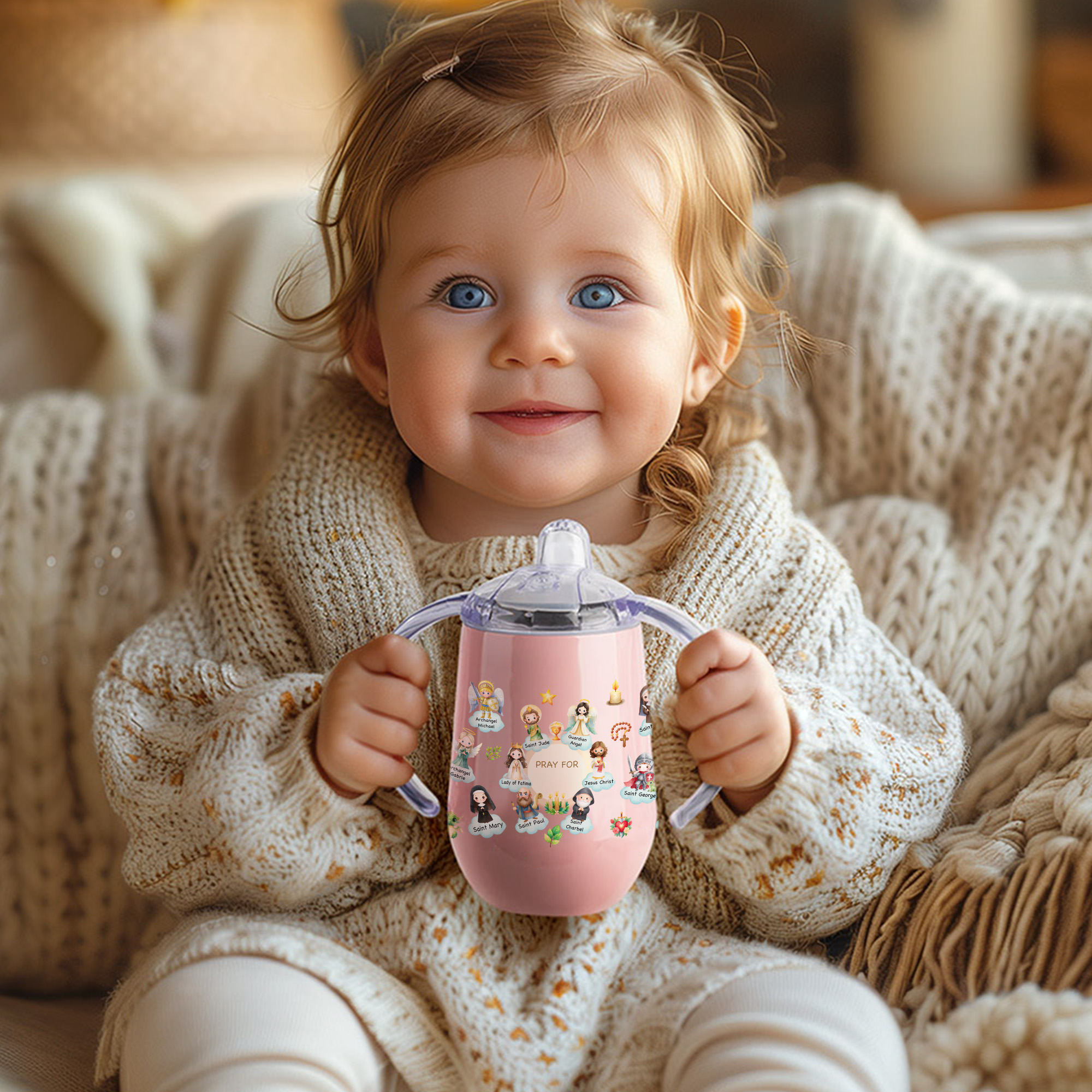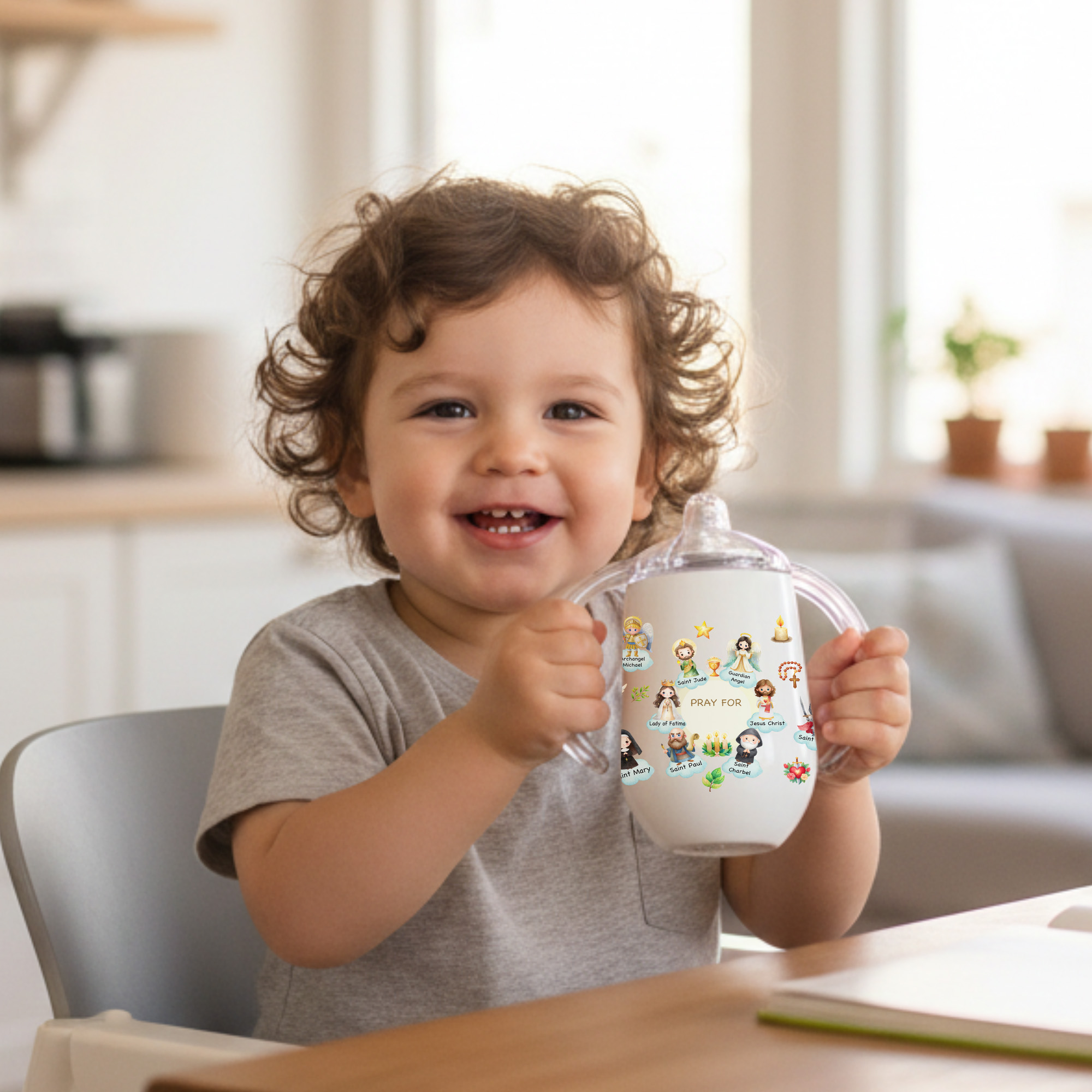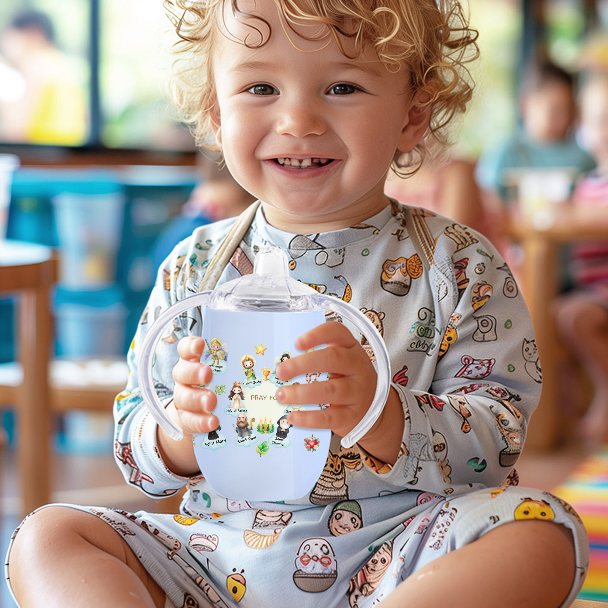 Liebevolles Design – Dieser 300-ml-Trinkbecher besticht durch ein liebevolles Motiv mit himmlischen Heiligen und sanften Illustrationen im Cartoon-Stil. Die eiförmige Form und die griffigen Henkel liegen gut in kleinen Händen, während die zarten religiösen Bilder eine bedeutungsvolle Note verleihen und Liebe, Führung und Segen symbolisieren.